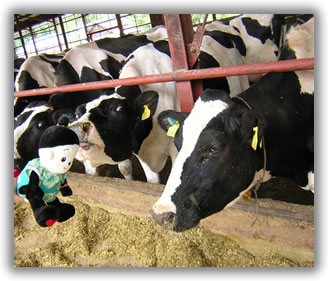 ここのペンションは牧場の中に有るのよ。 目の前が牛さんのおうちなの。 牛さんに「お揃いだね」って挨拶したんだけど、「おまえ、何だ」って顔されちゃったわ。 でも、あたちに興味が有る牛さんもいたみたいね。