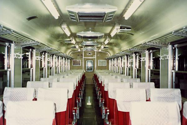 急行かいもんの座席車車内。グリーン車転用のシートがずらりと並んでいます。